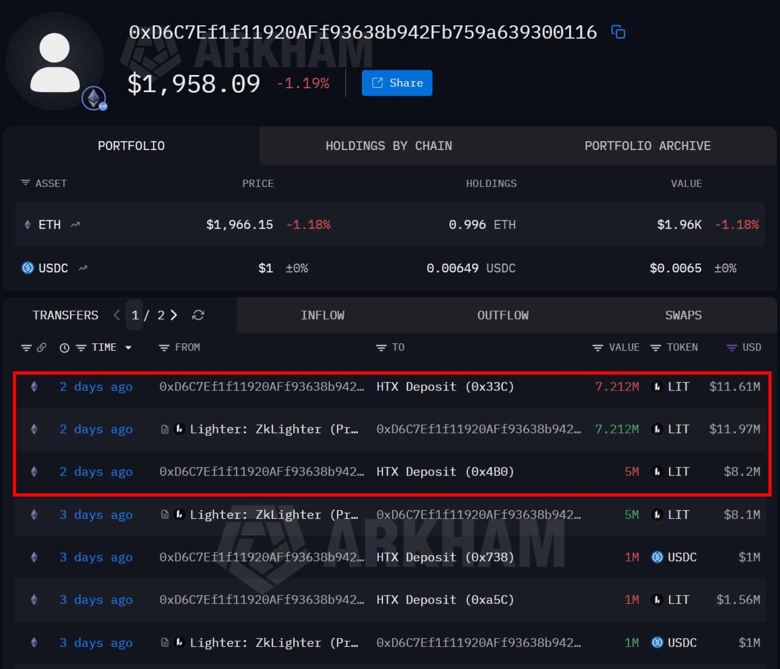 Unterdessen baute Wintermute den LIT-Bestand auf, was die Erwartungen einer höheren Aktivität verstärkte. Im Gegensatz dazu HTX geroutet 6,5 Millionen LITs in die zkLighter-Infrastruktur, was eher auf die Bereitstellung des Ökosystems als auf den sofortigen Verkauf hinweist.