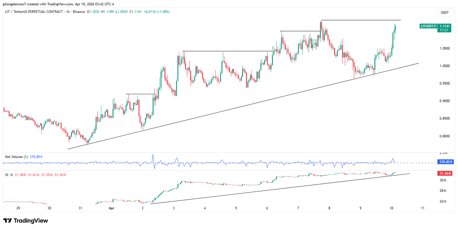 Unterdessen stieg das Open Interest (OI) für das LIT/USDT-Paar für unbefristete Verträge von Binance von 25 Millionen US-Dollar auf 31 Millionen US-Dollar. Darüber hinaus sprang das Nettovolumen auf ein Tageshoch von 1,22 Millionen LIT-Token, ist seitdem aber fast vollständig zurückgegangen, was auf Gewinnmitnahmen hindeutet.