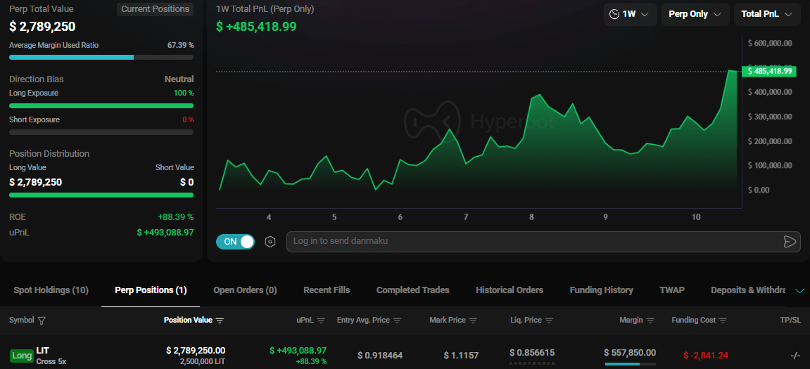 Beispielsweise kaufte ein Wal eine 5-fach gehebelte Long-Position von 2,5 Millionen LIT-Tokens zu einem Durchschnittspreis von 0,9184 $. Dieser Kauf hat möglicherweise die Rally angeheizt, die über 1 US-Dollar brach.