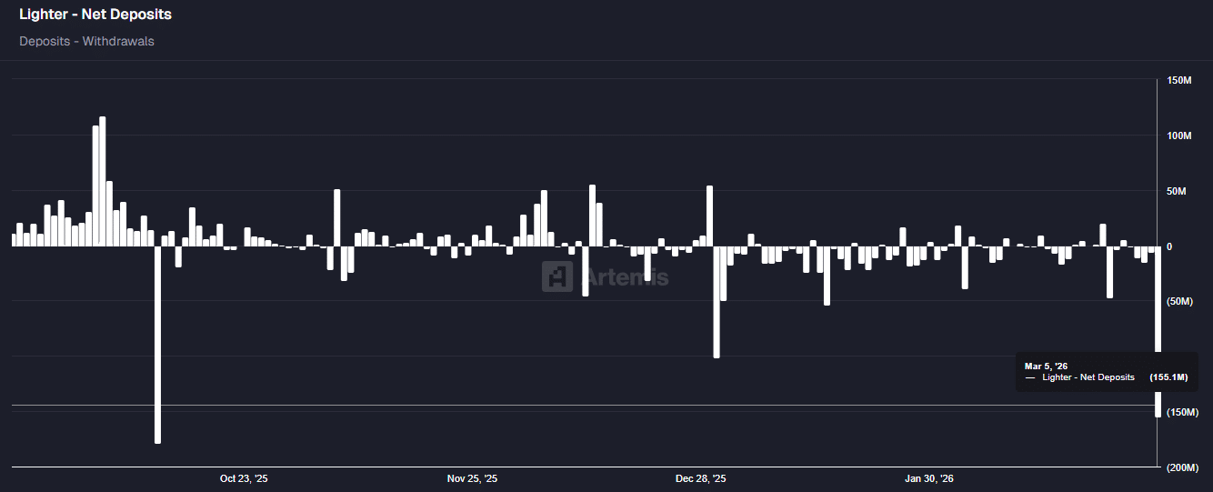 Ein genauerer Blick auf den Lighter DEX bestätigte die Erkenntnisse des Analysten mit Artemis Daten am 5. März wurden satte 155,1 Millionen US-Dollar an Nettoabflüssen verzeichnet.