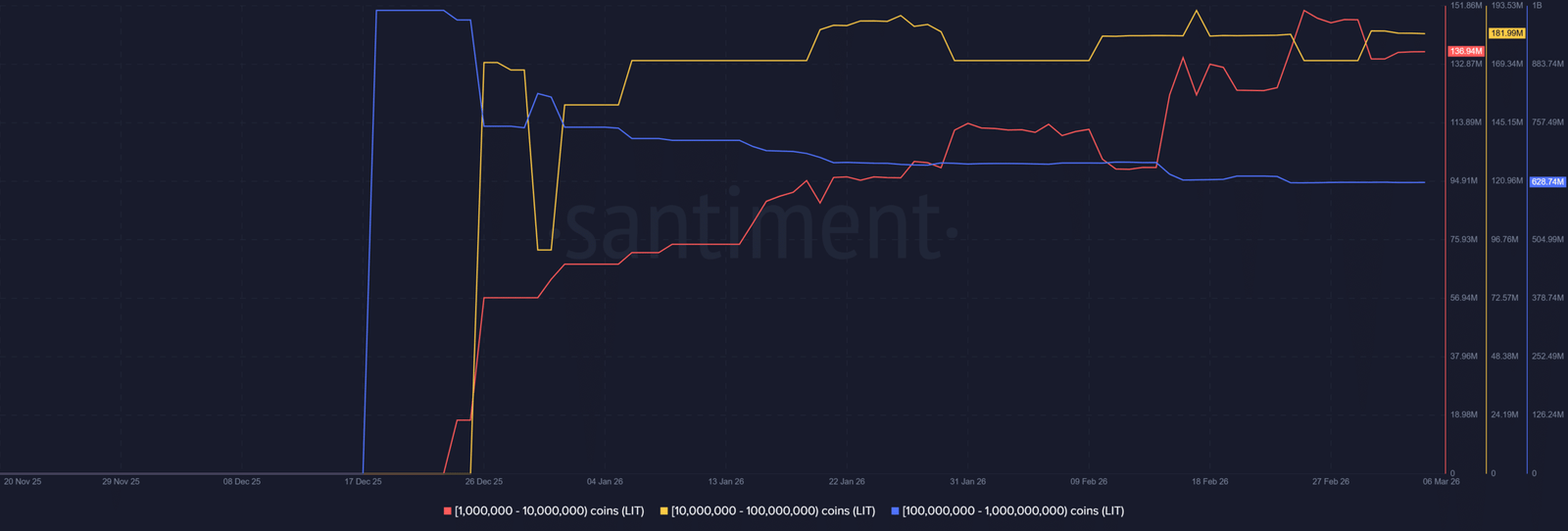 Santiment zeigte, dass Wallets mit einem Wert von 1 Million bis 1 Milliarde LIT im März keine Veränderungen in ihrem Kontostand zeigten, geschweige denn am Donnerstag – ein Zeichen dafür, dass der jüngste Ausverkauf wahrscheinlich von Privatanlegern und Leverage-Händlern vorangetrieben wurde.