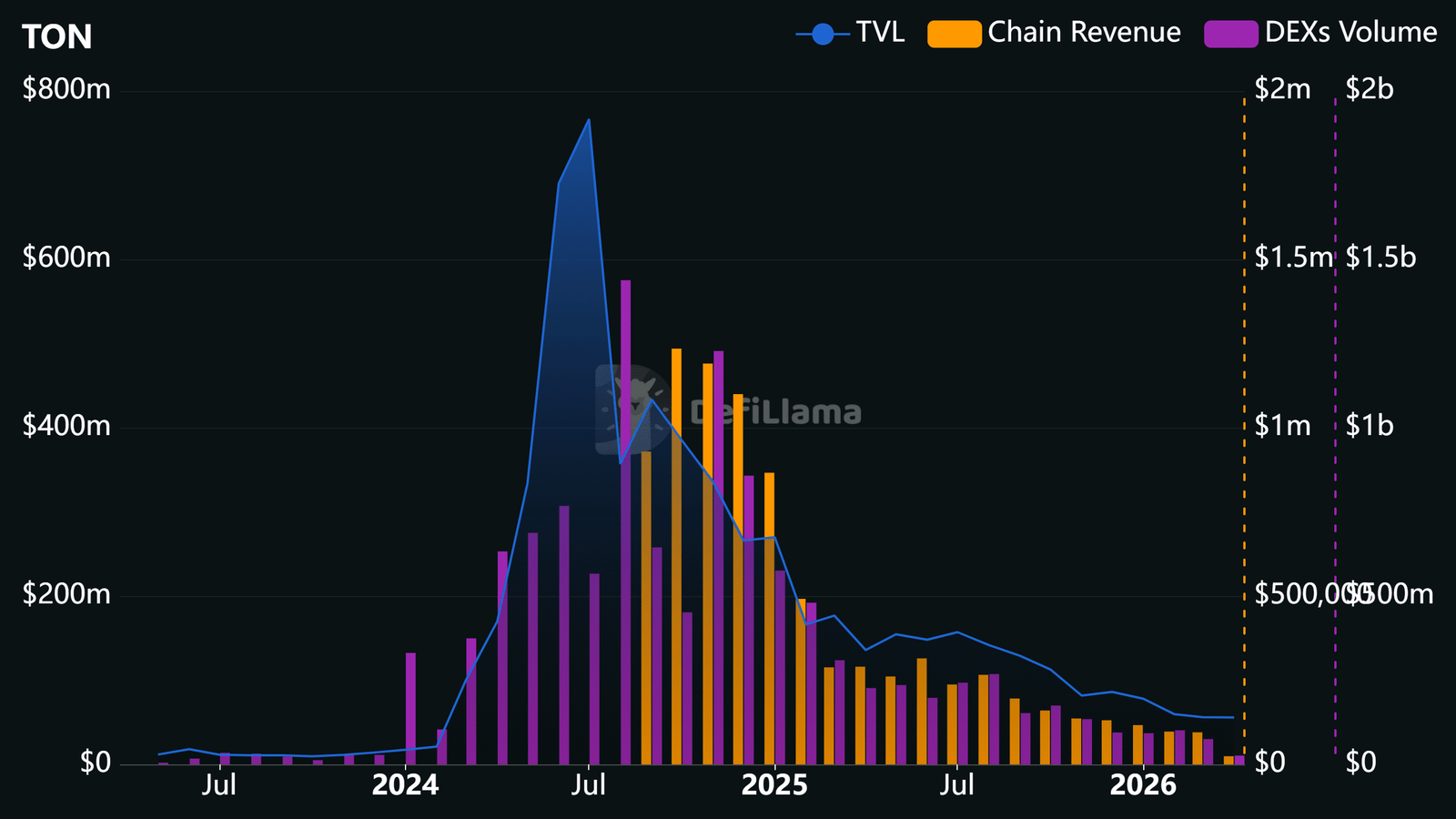 Das DEX-Volumen ist vom Höchststand im Jahr 2024 von 1,4 Milliarden US-Dollar auf 26 Millionen US-Dollar im April 2026 gesunken. Ebenso ist der TVL (Total Locked Value) von einem Rekordhoch von 766 Millionen US-Dollar auf 55 Millionen US-Dollar gesunken.