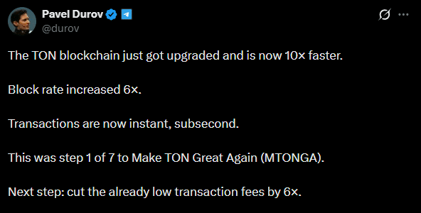 Durov fügte hinzu, dass die zehnmal schnellere Geschwindigkeit der erste der sieben Schritte des Überarbeitungsplans der Blockchain sei, der als Make TON Great Again (MTONGA)-Framework bezeichnet wird. Im zweiten Schritt werden die Transaktionskosten um das Sechsfache gesenkt.