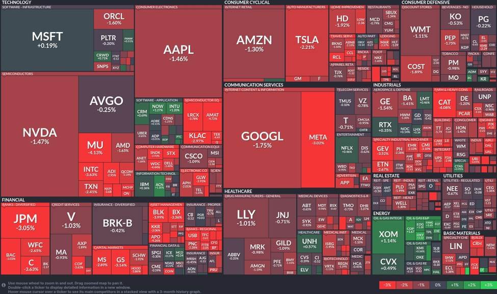 - Trotz der insgesamt negativen Entwicklung zeigte der Finanzsektor gemischte Ergebnisse. JPMorgan Chase (JPM) fiel um 3,05 %, während andere Institutionen wie Visa (V) und Mastercard (MA) leichte Rückgänge von 1,03 % bzw. 0,93 % verzeichneten. Dies spiegelt unsichere Wirtschaftsprognosen wider, die das Anlegervertrauen beeinträchtigen.