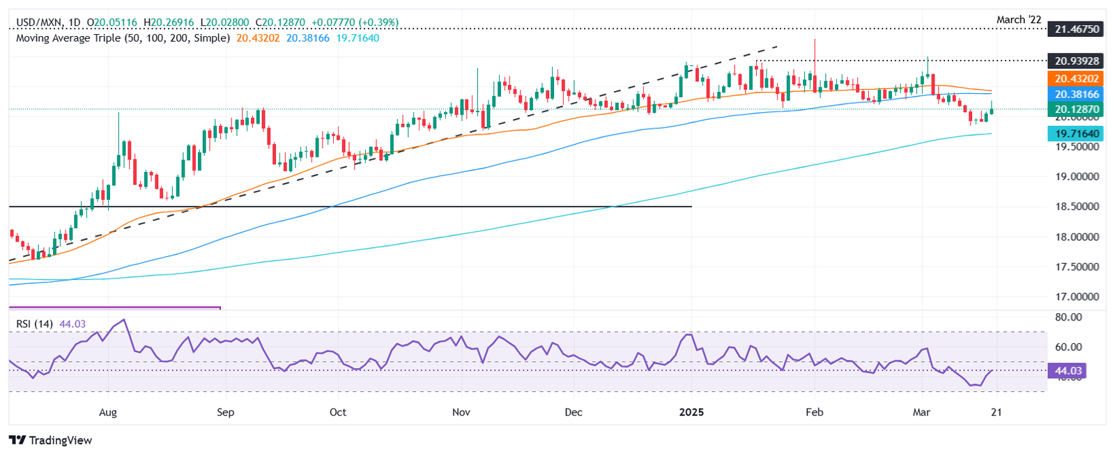 USD/MXN fiel am 14. März mit 19,84 die jährlichen Tiefststände ab, obwohl es beim 100-Tage-einfachen gleitenden Durchschnitt (SMA) mit 20,35 steifem Widerstand ausgesetzt ist.
