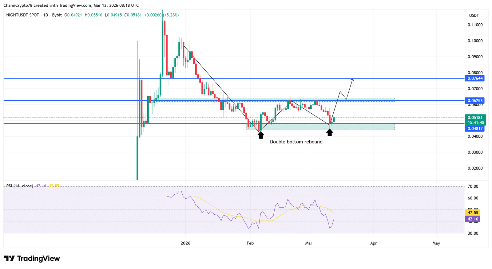 Die Preisbewegung zeigt sich jetzt NACHT Erholung von einer klar definierten Nachfragezone nahe 0,04817 $, wo Käufer zuvor zweimal eingegriffen haben, um den Abwärtsdruck abzuwehren.
