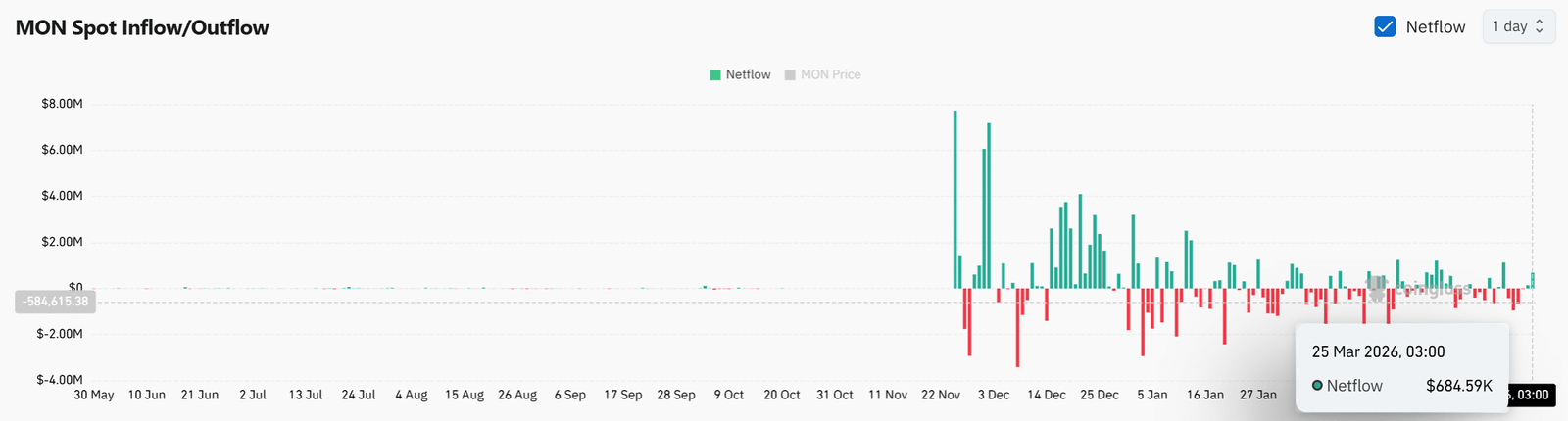 Aktuelle Netflow-Daten zeigen einen Zufluss von +684.000 US-Dollar, was darauf hindeutet, dass Token wieder an die Börsen gelangen. Diese Verschiebung führt zu einer anderen Dynamik als in früheren Phasen, in denen Abflüsse dominierten.