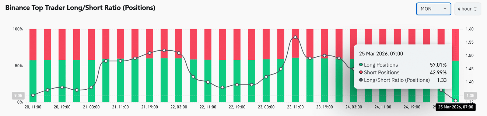 Die Top-Händler von Binance behalten eine klare Long-Tendenz bei, mit Long-Positionen bei 57,01 % und einem Long/Short-Verhältnis nahe 1,33.