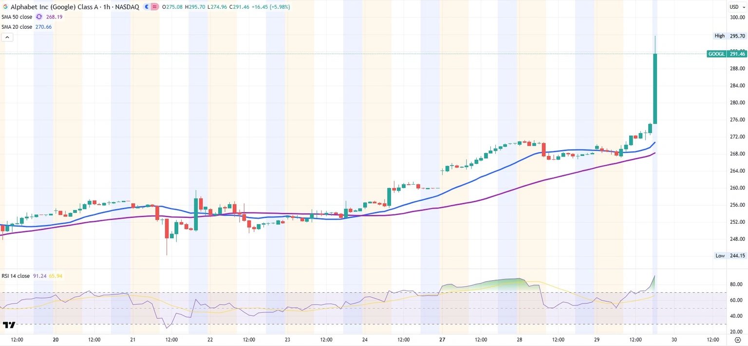 Alphabet war der Star nach Feierabend. Der GAAP-EPS von 2,87 US-Dollar wurde um 0,61 US-Dollar übertroffen, und der Umsatz stieg im Jahresvergleich um 16 % auf 102,35 Milliarden US-Dollar und übertraf den Konsens um 2,2 Milliarden US-Dollar. Der Umsatz mit Google Services stieg im Jahresvergleich um 14 %, während der Umsatz mit Google Cloud in diesem Zeitraum um 34 % stieg.