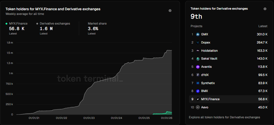 Daten des Token-Terminals zeigten, dass die Zahl der Spotinhaber von einem Höchststand nahe 71,2.000 auf 56,8.000 sank. Gemessen an der Anzahl der Inhaber belegte MYX den neunten Platz unter den DEX-Token.