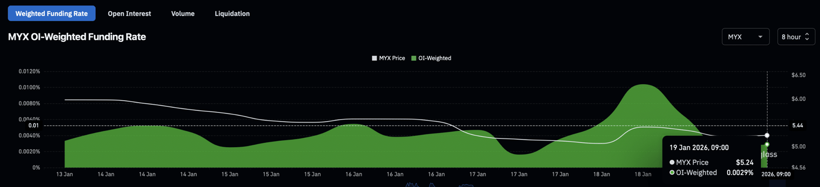 Die Open Interest-Weighted Funding Rate, eine Kennzahl, mit der gemessen wird, ob Perpetual-Händler bullisch oder bärisch tendieren, deutete darauf hin, dass MYX weiterhin in Richtung bullischer Tendenz tendiert.