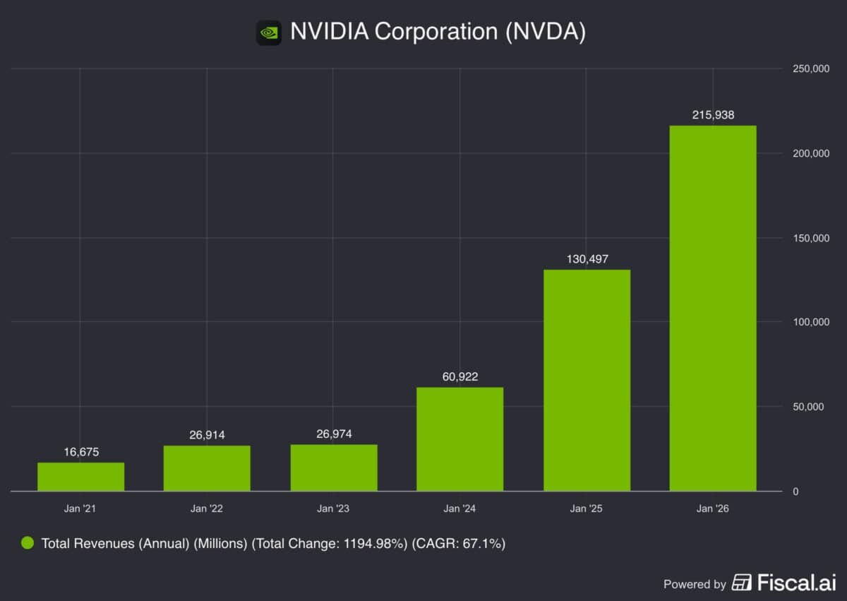 Das Wachstum von Nvidia seit 2021 ist das, wovon Investoren träumen. Der Umsatz ist in den letzten fünf Jahren von 16,6 Milliarden US-Dollar auf 215,9 Milliarden US-Dollar gestiegen, was einer durchschnittlichen jährlichen Steigerung von 67 % entspricht.