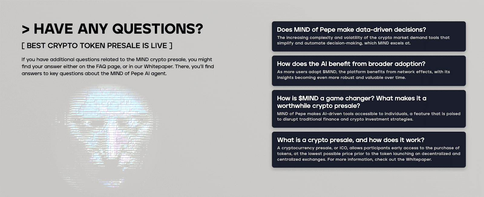 Über den Meme -Münzfaktor hinaus wird Mind of Pepe auch die KI -Erzählung in Crypto nutzen, die immer noch unglaublich heiß ist und wahrscheinlich noch heißer wird.