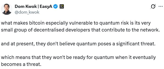 Andere, wie der Gründer von Capriole Investments, Charles Edwards, Sicht Quantencomputer sehen eine potenzielle „existentielle Bedrohung“ für Bitcoin und argumentieren, dass jetzt ein Upgrade erforderlich sei, um die Netzwerksicherheit zu stärken.