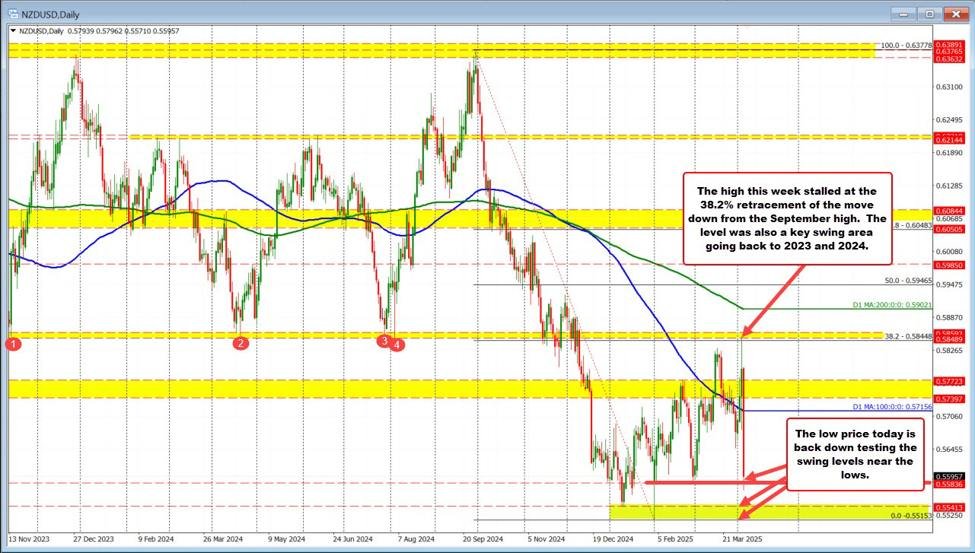 In der Daily Chart durchbohrte das gestrige High kurz kurz 38,2% Retracement des Niedergangs aus dem September 2024 Hocherreichen 0,58522direkt über dem Rückzugsniveau bei 0,58448. Die Käufer konnten diesen Ausbruch jedoch nicht halten, und der Preis drehte sich schnell zurück nach unten.