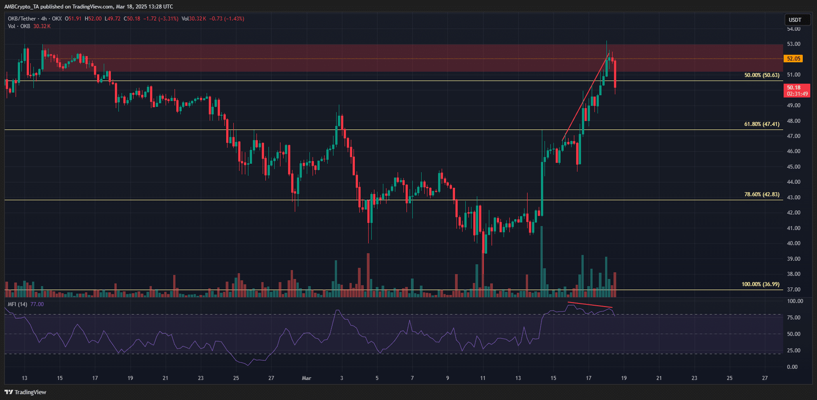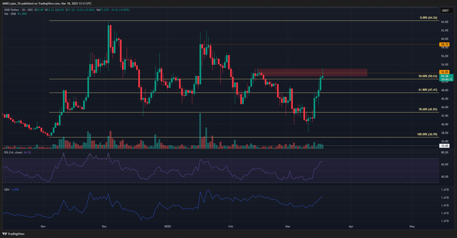 UN [OKB]Das Exchange -Token des Crypto Exchange Okex hat in den letzten Tagen solide Gewinne erzielt. Der Preis stieg in der vergangenen Woche um fast 35%, nachdem er am 11. März auf 38 Dollar gesunken war.