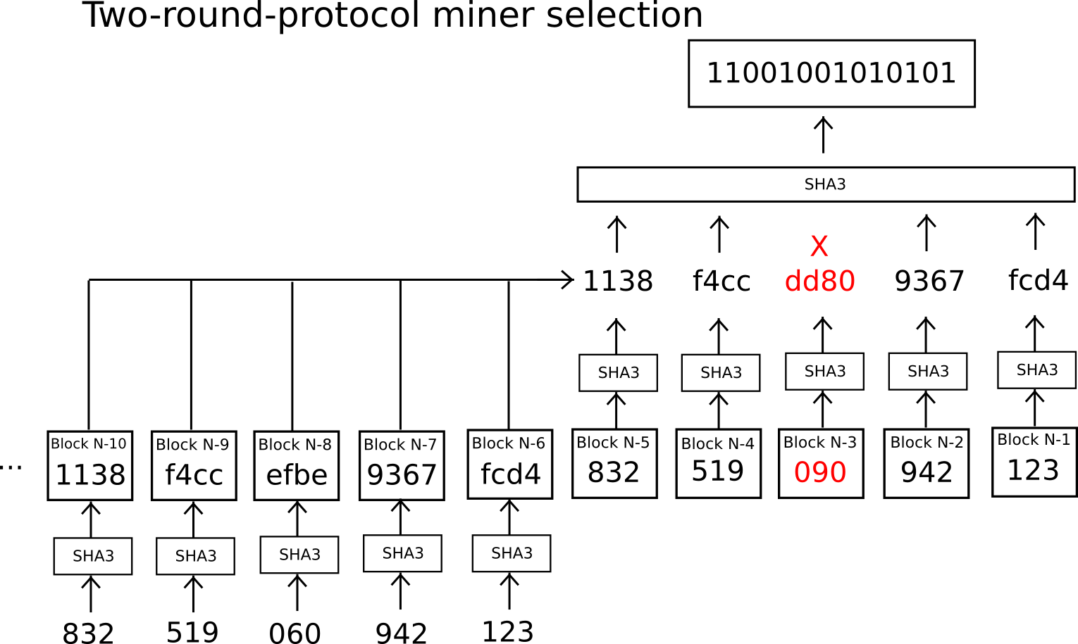 But then if block signers are decided in advance, another issue arises: if done wrong, block signers could “mine” their blocks, repeatedly trying to create a block with different random data until the resulting block triggers that same signer having the privilege to sign a block again very soon. For example, if the signer for block N+1000 was simply chosen from the hash of block N, and an attacker had 1% stake, then the attacker could keep rebuilding the block until block N+1000 also had the attacker as its signer (ie. an expected 100 iterations). Over time, the attacker would naturally gain signing privilege on other blocks, and thus eventually come to completely saturate the blockchain with length-1000 cycles controlled by himself. Even if the hash of 100 blocks put together is used, it’s possible to manipulate the value. Thus, the question is, how do we determine what the signers for future blocks are going to be?