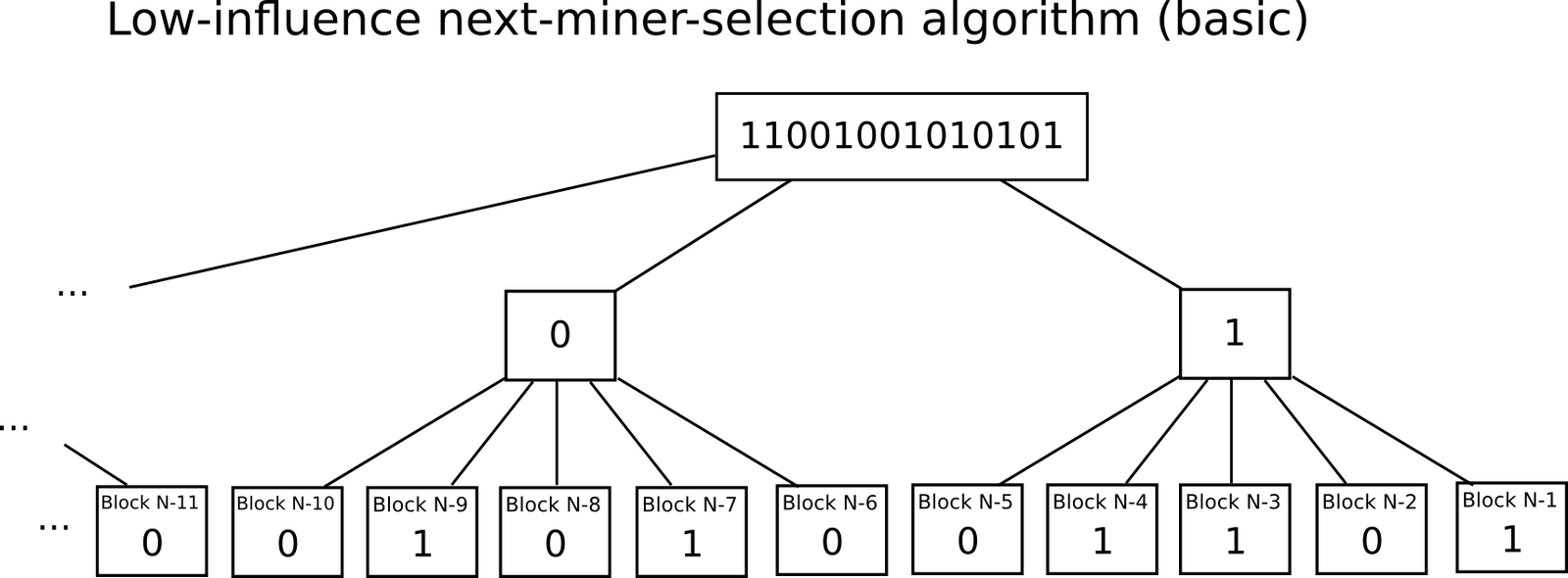 Another idea, proposed by Iddo Bentov and others in their “Cryptocurrencies Without Proof of Work” paper, is to use something called a “low-influence” function – essentially, a function such that there is only a very low chance that a single actor will be able to change the result by changing the input. A simple example of an LIF over small sets is majority rule; here, because we are trying to pick a random miner, we have a very large set of options to choose from, so majority rule per bit is used (eg. if you have 500 parties and you want to pick a random miner out of a billion, assign them into thirty groups of 17, and have each group vote on whether their particular bit is zero or one, and then recombine the bits as a binary number at the end). This removes the need for a complicated two-step protocol, allowing it to potentially be done much more quickly and even in parallel, reducing the risk that the pre-chosen stake-miners for some particular block will get together and collude.