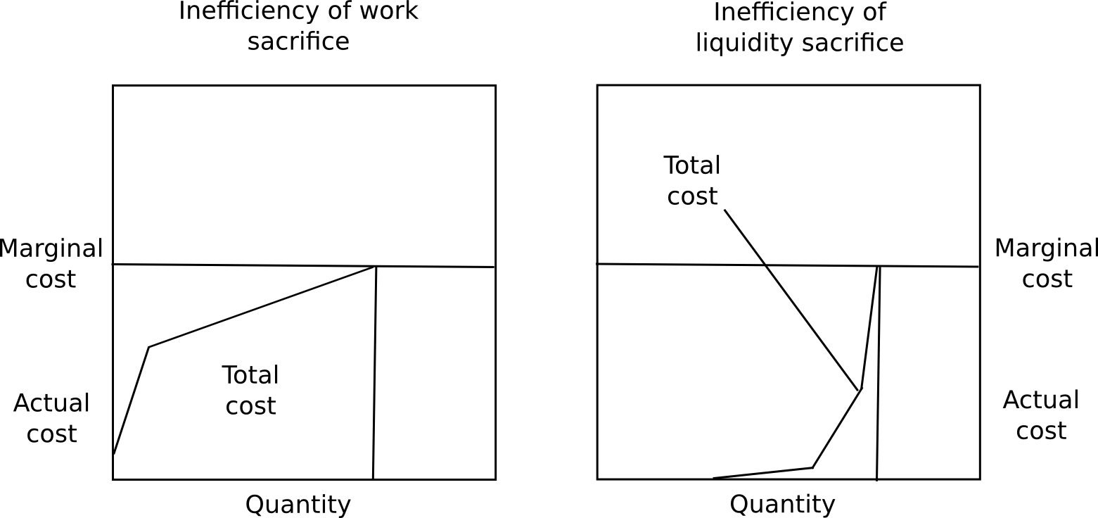 The last option, liquidity sacrifice, is in between the two. Although liquidity sacrifice is costly, there is a substantial amount of disparity in how much people value liquidity. Some people, like individual users or businesses with low savings, heavily value liquidity; others, like savers, do not value liquidity at all (eg. I could not care less if I lost the ability to spend ten of my bitcoins for some duration). Hence, although the marginal cost of liquidity will be high (specifically, necessarily equal to either the mining reward or the transaction fee), the average cost is much lower. Hence, there is a leverage effect that allows the cost of an attack to be much higher than the inefficiency of the network, or the amount that senders spend on txfees. Additionally, note that in Larimer’s scheme specifically, things are rigged in such a a way that all liquidity that is sacrificed in consensus is liquidity that was being sacrificed anyway (namely, by not sending coins earlier), so the practical level of inefficiency is zero.