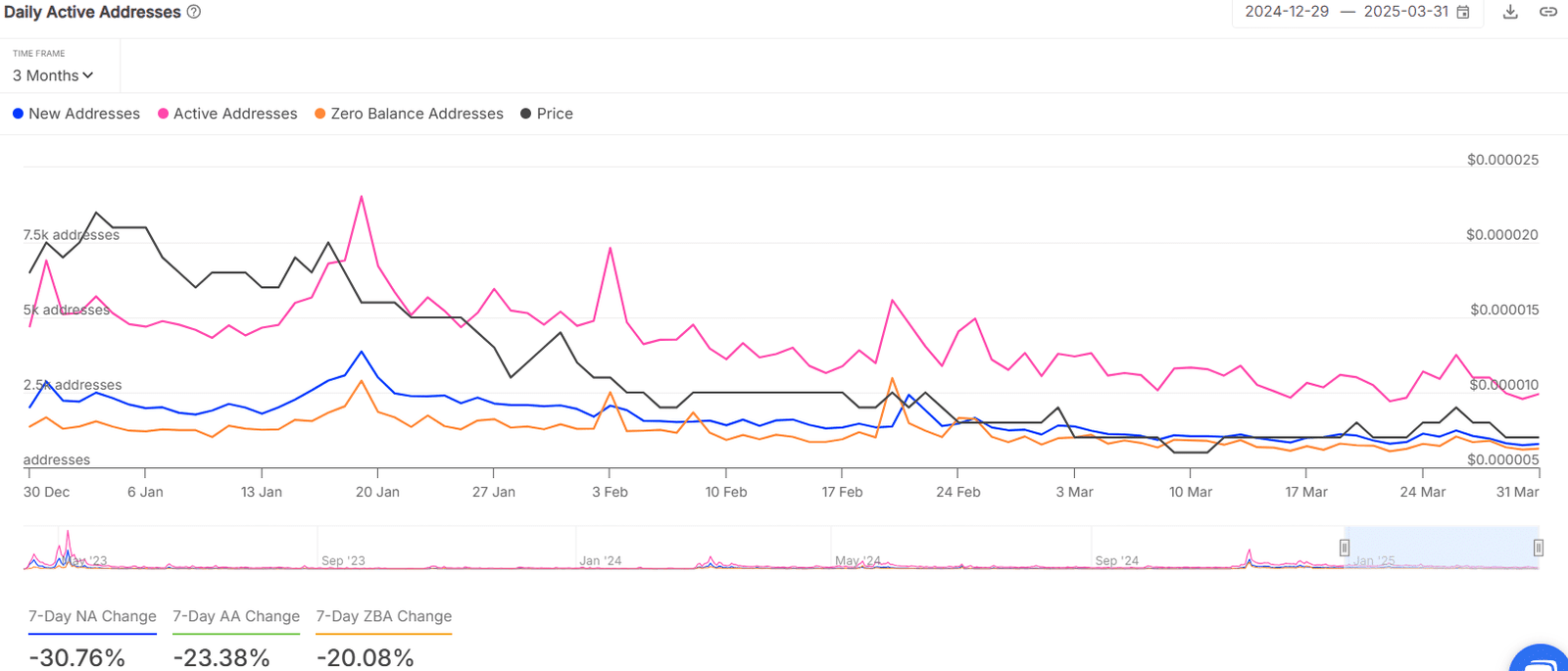 Die 7-tägige Änderung der neuen Pepe Adressen, aktive Adressen und Nullbilanzadressen waren alle negativ. Wenn wir weiter vergrößern, können wir sehen, dass die metrischen Daily Active -Adressen seit dem 20. Januar sinken.