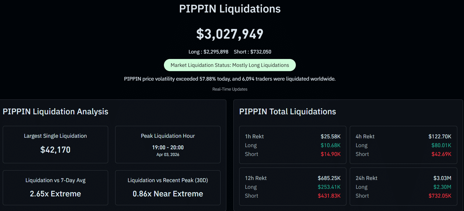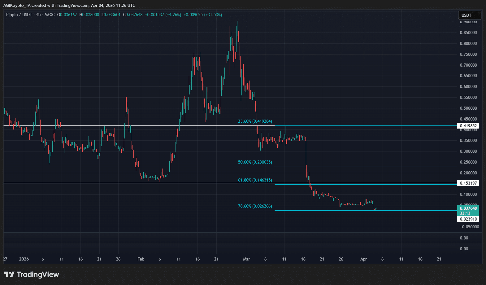 Pippins [PIPPIN] Der Markt wechselte von der Expansion zur Erschöpfung, da ein starker Rückgang von fast 0,80 $ auf 0,035 $ einen deutlichen Liquiditätsschub signalisierte. Dieser Anstieg überschritt bei steigendem Volumen 44 %, was auf erzwungene Ausstiege hindeutet, da die spekulative Dynamik nachlässt.