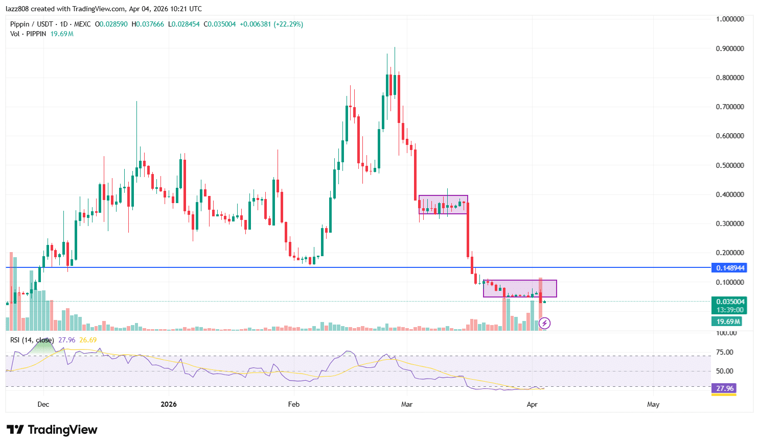 Jetzt erscheint das gleiche Muster wieder in der Nähe von 0,035 $, wo der Preis nach dem Rückgang komprimiert wird. Dies geschieht, weil die Verkäufer die Unterstützung ausschöpfen, während die Käufer vorsichtig eingreifen. Zum Zeitpunkt der Drucklegung näherte sich der RSI 27,9, was auf überverkaufte Bedingungen hindeutet, was darauf hindeutet, dass der Verkaufsdruck nachlässt.