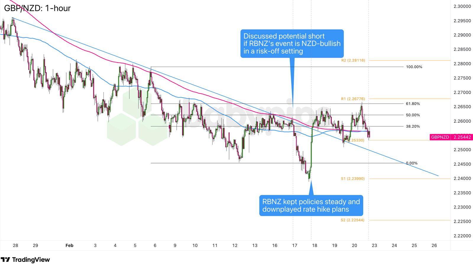 The RBNZ outcome was NZD-bearish, not NZD-bullish — the exact opposite of what this setup required. Rather than GBP/NZD facing downside pressure from a hawkish Kiwi, the pair surged sharply on the dovish RBNZ surprise. The pair extended gains in subsequent sessions, moving well above the 2.2600 resistance area that the setup anticipated as a ceiling.