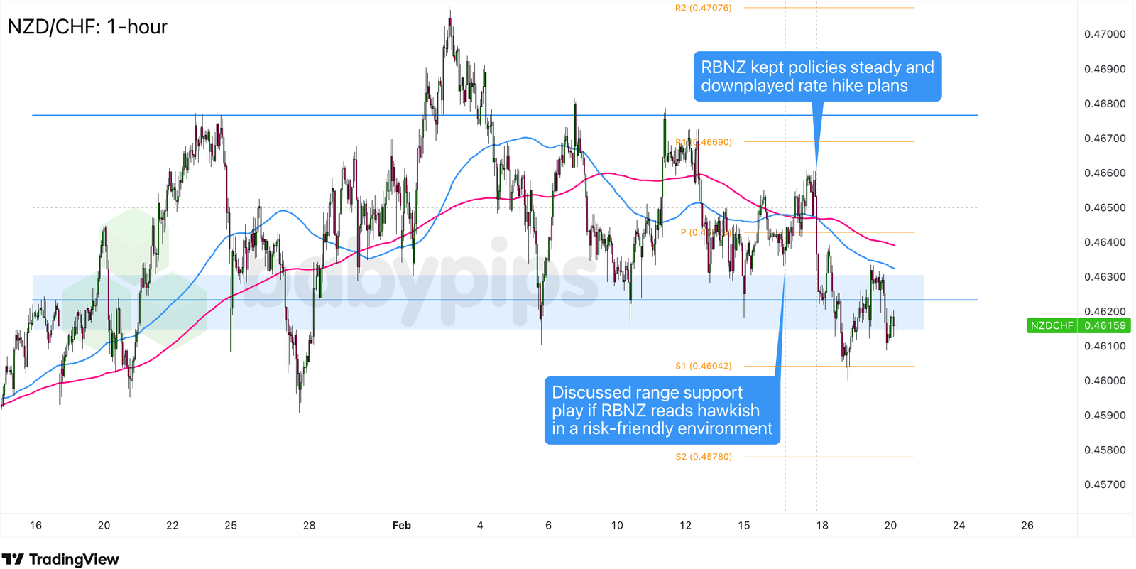 Our watchlist for NZD/CHF bullish discussed a potential push toward the R1 Pivot Point (0.4670) and the 0.4680 range resistance in a risk-friendly environment if the RBNZ’s updated inflation forecasts pointed to near-term rate hike strength. NZD/CHF had been holding technical support at the 0.4620 area going into the event.