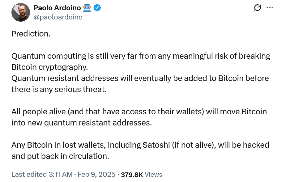 Im Februar der Tether -CEO Paolo Ardoino sagte Die Sorge ist begründet ist aber zuversichtlich Das Quantensichere Bitcoin-Adressen wird weit vor einer „ernsthaften Bedrohung“ umgesetzt.