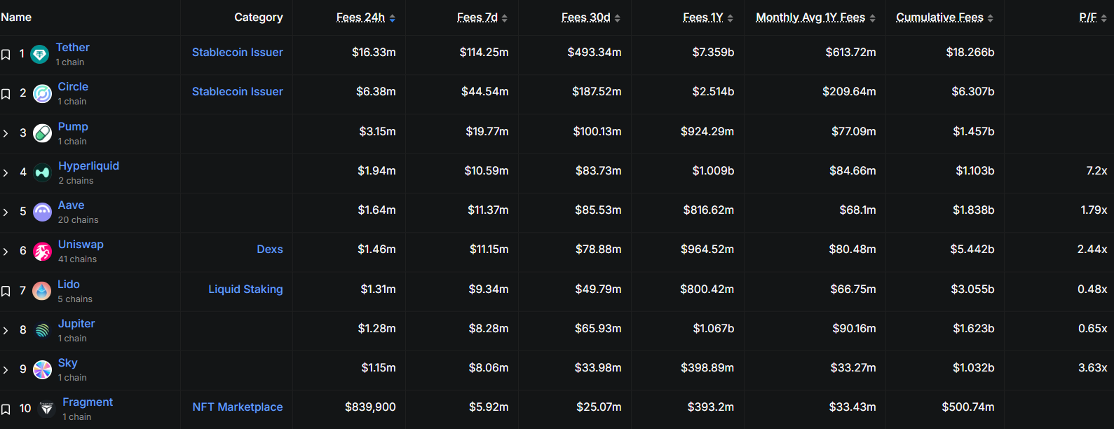 Uniswap verzeichnete 1,46 Millionen US-Dollar an 24-Stunden-Gebühren und 964,52 Millionen US-Dollar über 30 Tage. Tether und Circle behielten eine deutlich höhere Gebührendominanz bei.