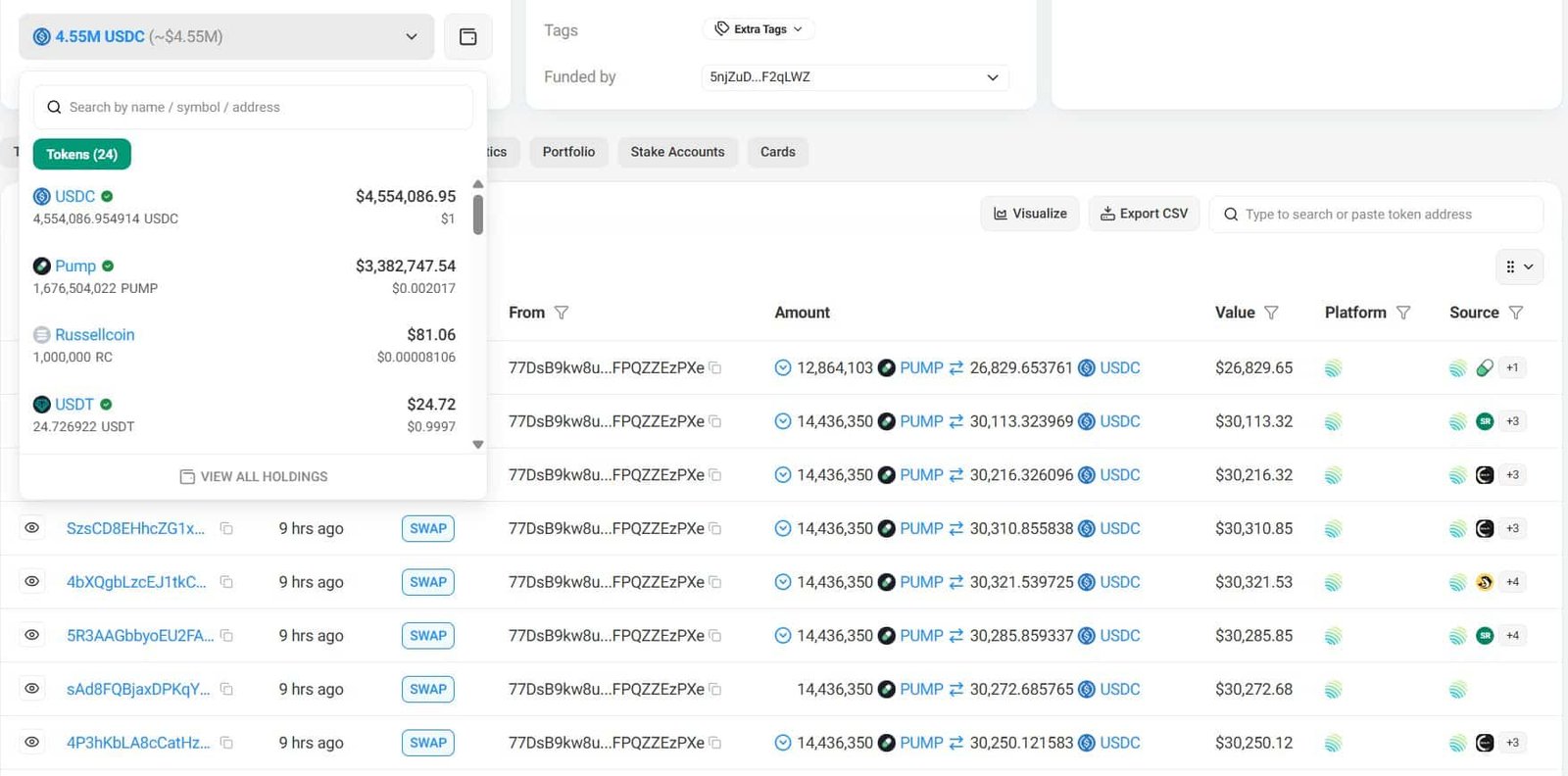 Der Verkaufsdruck entstand, nachdem die mit „77DsB…“ verknüpfte Wallet begann, große Pump.fun-Chargen in USDC abzuladen.