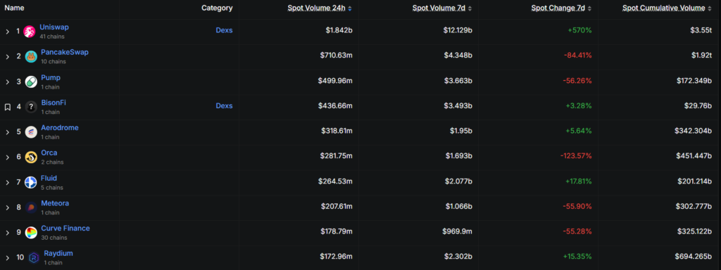 Uniswap führt mit einem 24-Stunden-Volumen von 1,84 Milliarden US-Dollar und einem wöchentlichen Volumen von 12,12 Milliarden US-Dollar Umsatzwas einem Anstieg von 570 % entspricht.