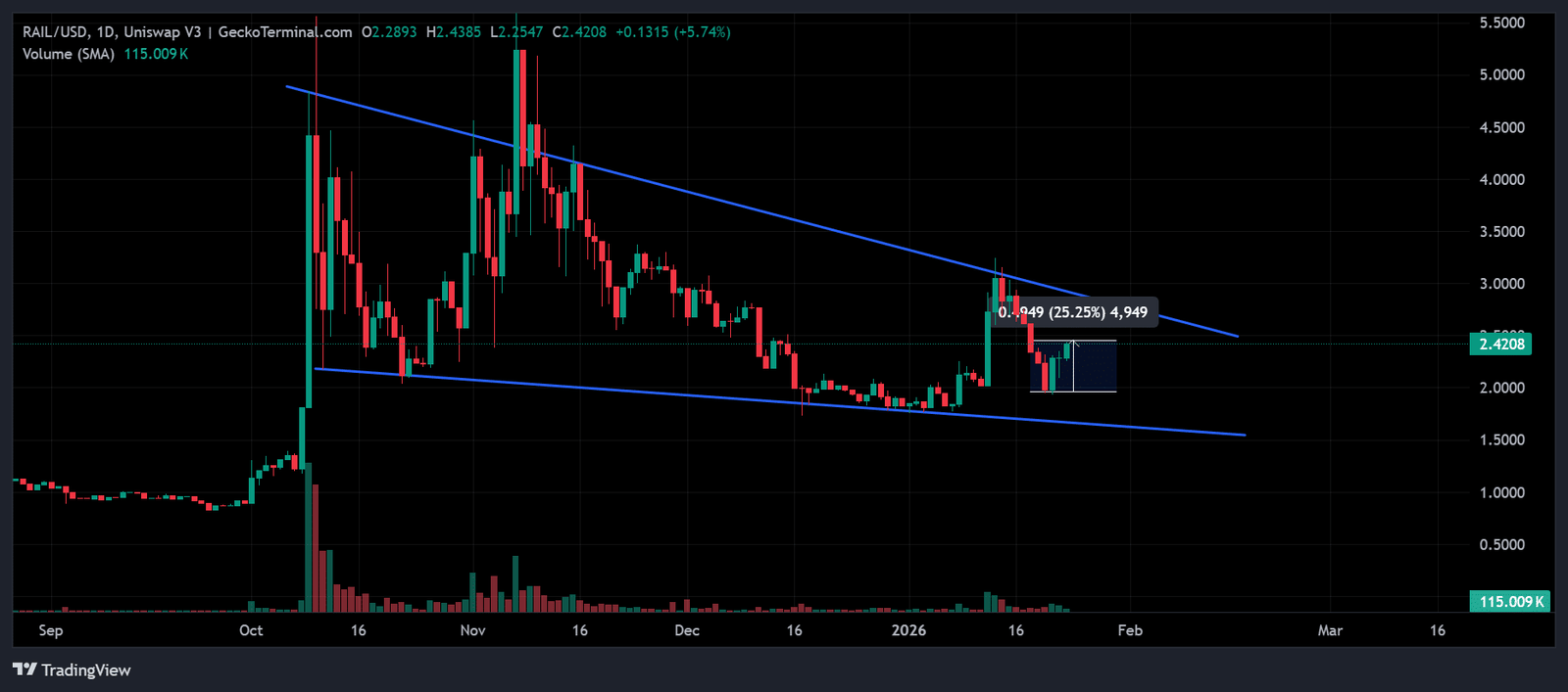 Der native Governance-Token RAIL geriet angesichts dieser wachsenden Netzwerkzugkraft nicht ins Hintertreffen. Tatsächlich erholte sich der Token nach dem Rückgang Anfang der Woche um 25 %.