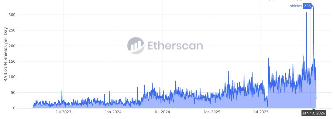 Tatsächlich ist die Anzahl der Schutzschilde pro Tag zur Verfolgung privater Geldbörsen seit 2025 stark gestiegen. Anfang 2026 erreichte die tägliche durchschnittliche Schutzschilde einen Rekordwert von 326, was die enorme Nachfrage nach Privatsphäre weiter bestätigt.