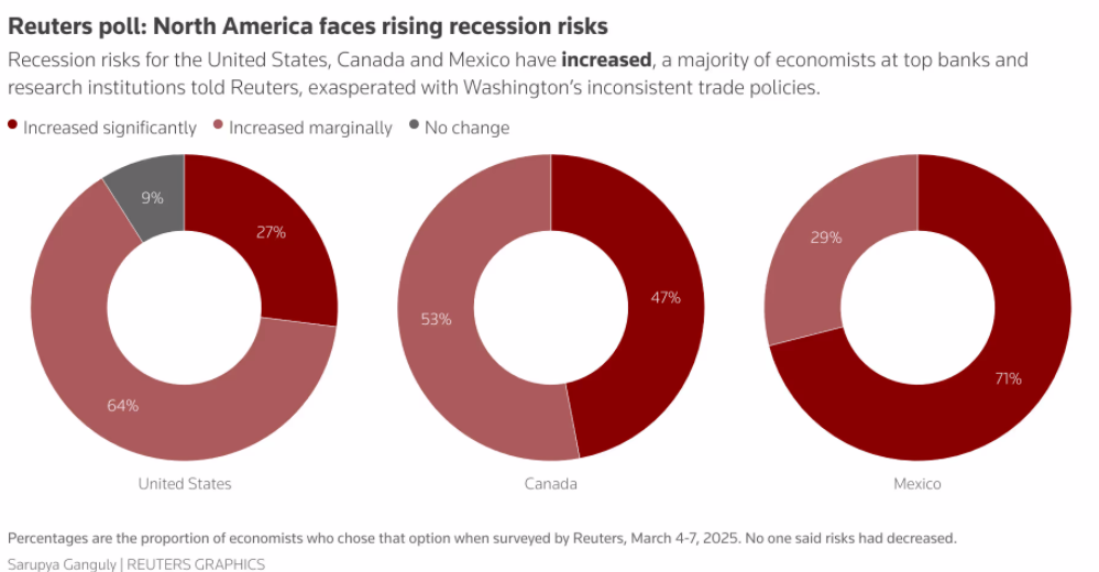 Eine Umfrage von Reuters ergab, dass 70 von 74 befragten Ökonomen darauf hindeuten, dass die Risiken der mexikanischen, kanadischen und amerikanischen Volkswirtschaften inmitten der umstrittenen Handelspolitik von US -Präsidenten (US), Donald Trump, auferlegen.