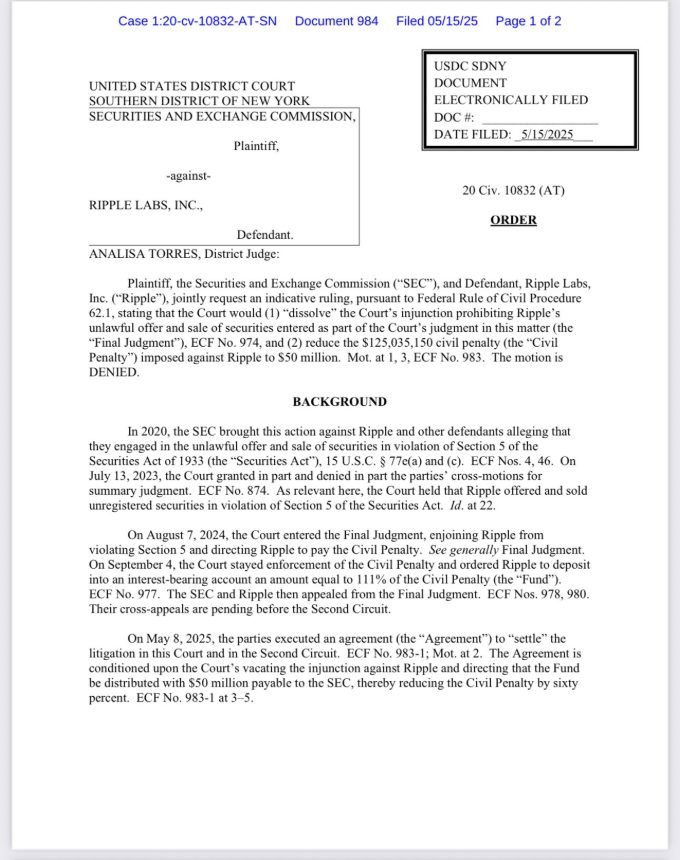 Ich bin jetzt! Einstellen as @JohnEdeaton1 Verschlüsst die Entscheidung von Richter Torres, den Antrag von SEC/Ripple auf die Siedlung zu verweigern.