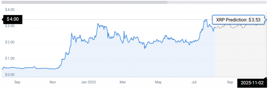 Laut conincodex zeigt die dreimonatige Analyse von Shiba Inu eine baubare Dynamik. XRP führt die Gebühr an, wobei sein Diagramm einen Weg zeigt, der das Token zum 3. November 2025 bei 3,53 USD führt.