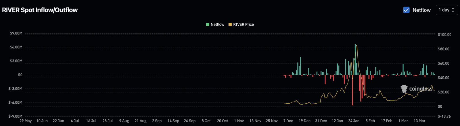 In diesem Zeitfenster wurden RIVER im Wert von rund 1,35 Millionen US-Dollar verkauft. Dieser Trend deutet darauf hin, dass Anleger ihr Engagement kurzfristig reduzieren und wahrscheinlich in Stablecoins oder risikoärmere Vermögenswerte umsteigen, solange die Unsicherheit anhält.