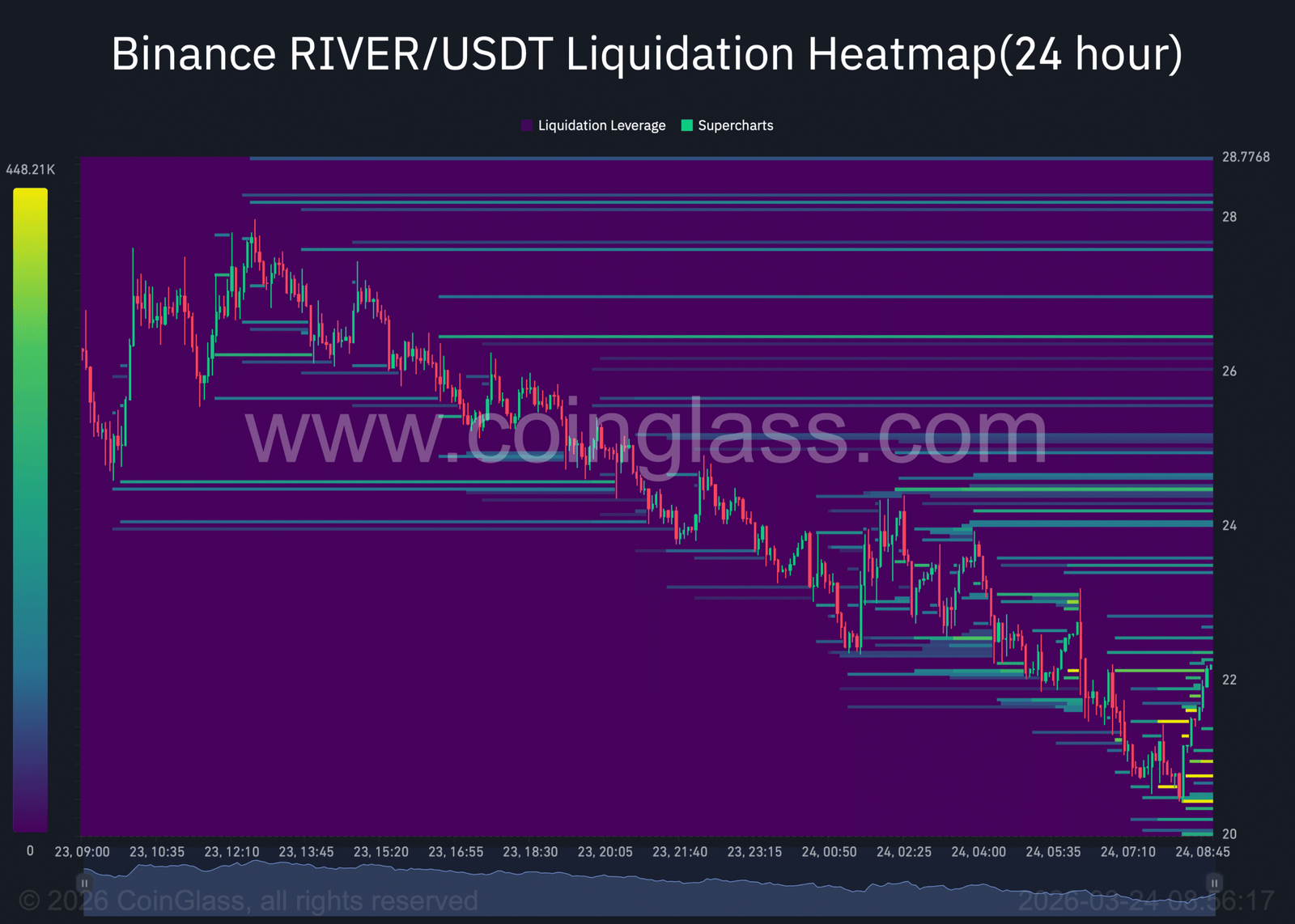 Im Fall von RIVER liegt ein größerer Anteil der Cluster über dem aktuellen Preis. Obwohl diese Cluster relativ flach sind, was bedeutet, dass sie einzeln möglicherweise keinen starken Einfluss ausüben, deutet ihr Vorhandensein dennoch auf eine mögliche Aufwärtstendenz in der Preisbewegung hin.