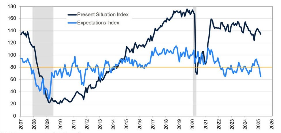 Das heißt, es waren vier Monate in Folge ein Schwanentauchgang im US -amerikanischen Verbrauchervertrauen und diese Serie ist seit dem 21. Januar am niedrigsten. Schlimmer noch, doch die Vorwärtsverwaltungsmaßnahme ist am niedrigsten seit 12 Jahren.