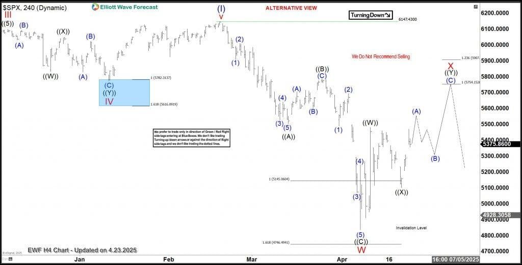 Das obige Diagramm zeigt, dass die Welle (II) am April -Tief im April endete und die Erholung für Wellen (iii) über dem Hochschicht im Februar höher auftreten sollte. Wenn der Tarif besteht, sollte dieses Szenario funktionieren und die Käufer steigen höher. Um unsere lange Position zu verstärken, möchten wir jedoch, dass der Rückprall ab April einen 5-Swing abschließt. Wenn die Welle (1) mit einer 5-Wellen-Struktur endet, können wir den nächsten 3/7-Schwungauszug aus der Blue Box kaufen und Käufer beitreten, während sie weiter drücken. Wenn der Tarif gefährdet, könnte SPX jedoch von höheren Preisen niedriger werden, wie das zweite Szenario unten zeigt.