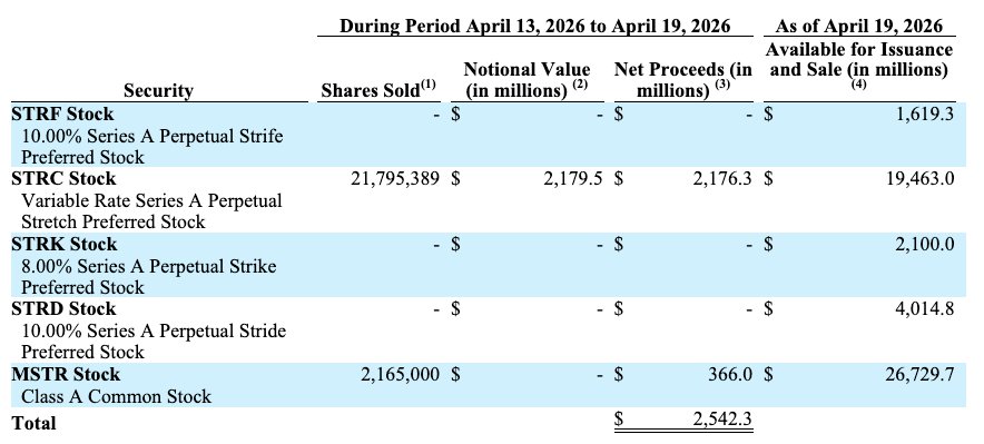 Den Angaben zufolge erwirtschaftete STRC 2,18 Milliarden US-Dollar oder etwa 85,7 % des Gesamterlöses, während der Verkauf von Stammaktien der Klasse A (MSTR) 366 Millionen US-Dollar beisteuerte.