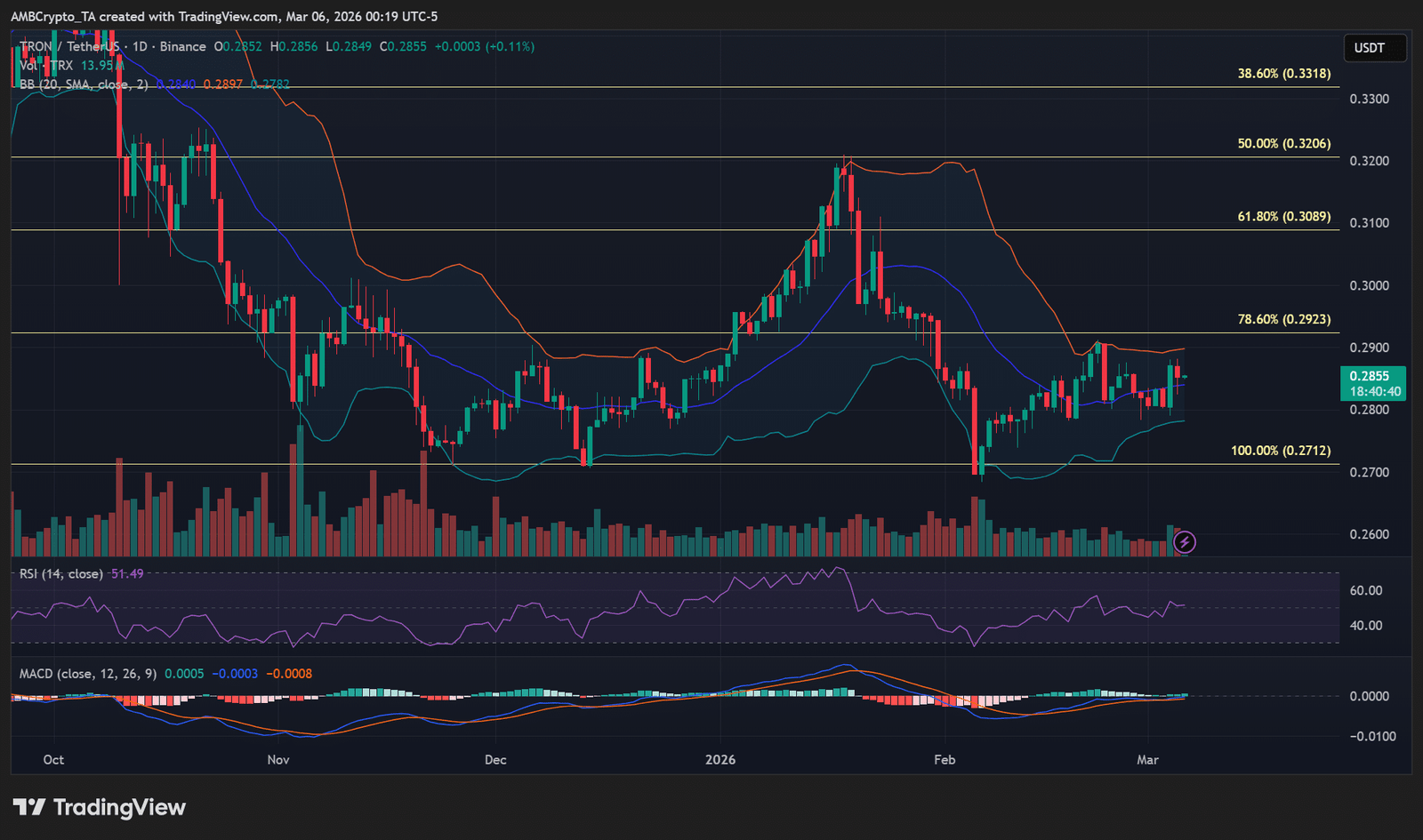 Allerdings reagierte der TRX-Preis zum Zeitpunkt des Schreibens nicht auf das Update. Der Altcoin wurde bei 0,28 $ gehandelt, nachdem er am 5. März nach dem leichten Rückgang von Bitcoin gesunken war.