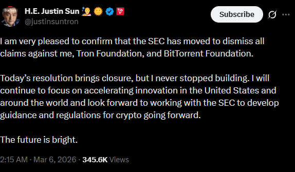 In einem separaten Social-Media-Beitrag berichtet Sun bestätigt die Abweisung des Verfahrens und stellte fest, dass dies zu einem „Abschluss“ geführt habe und die Zukunft rosig aussehen werde.