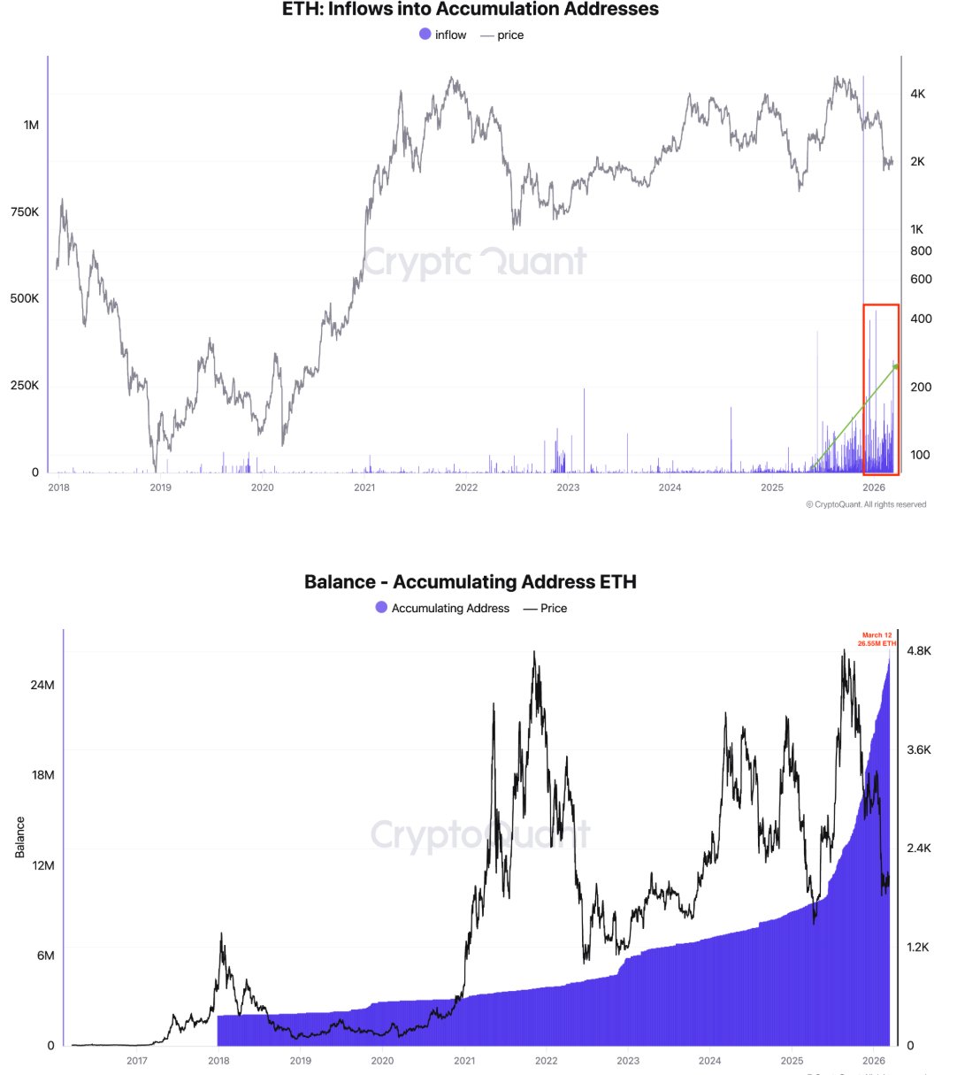 Darüber hinaus sind die täglichen Zuflüsse in Akkumulationsadressen seit Mitte 2025 stetig gestiegen und erreichten im November 2025 ein Rekordhoch von 1,14 Millionen ETH. Die Zuflüsse sind im Jahr 2026 weiter gestiegen und liegen bei durchschnittlich 200.000 ETH pro Tag, mit einem Spitzenwert auf über 350.000 am Donnerstag.
