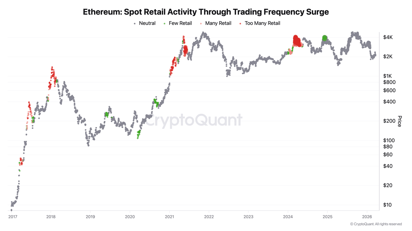 Historisch gesehen neigen kleinere Anleger dazu, zu kaufen, wenn die Preise bereits hoch sind, was auf die FOMO zurückzuführen ist. Dies geschah in vergangenen Zyklen wie 2018, 2021 und sogar 2024.