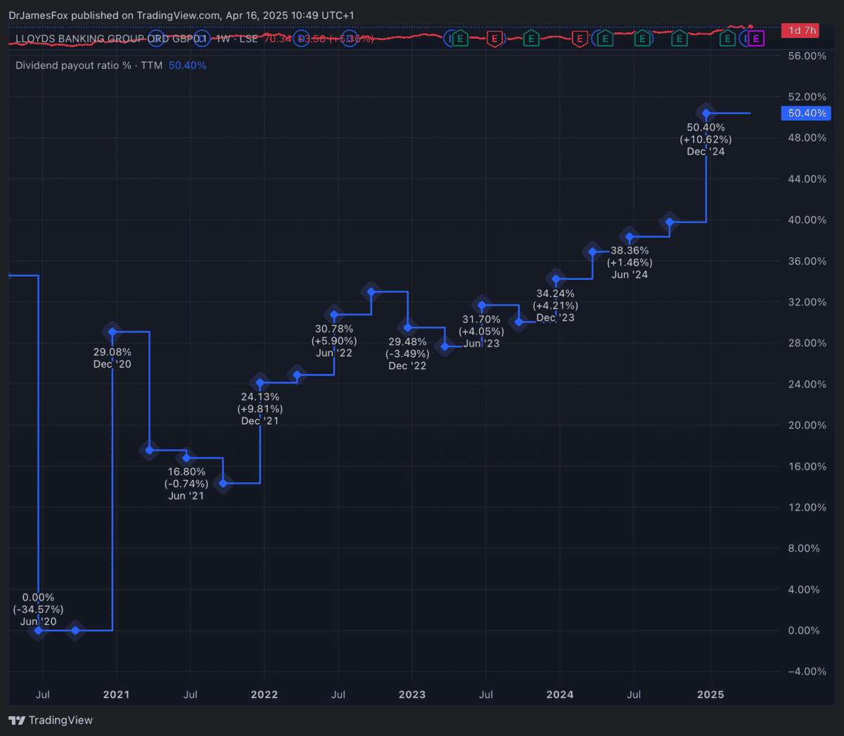 Mit Blick auf die Zukunft wird die Vorwärtsgewinne von Lloyds prognostiziert, um sich zu verbessern. Das Ergebnis je Aktie (EPS) wird im Jahr 2025 mit 6,5 Pence prognostiziert und steigt 2026 auf 8,85 Pence und 2027 10,68p.