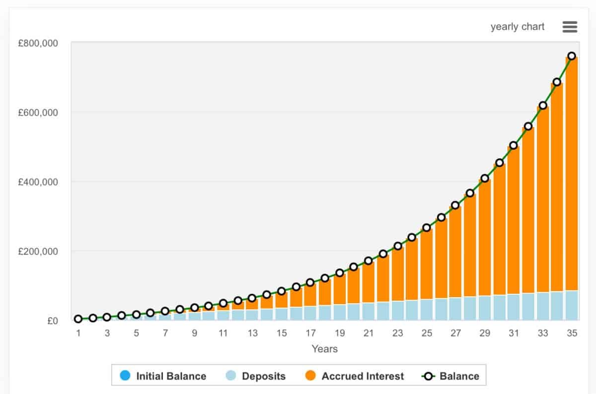 Wie wir aus der folgenden Tabelle erkennen können, könnten 200 GBP pro Monat mit 10% mit einem annualisierten Wachstum (was nicht jeder erreichen kann) in fast 800.000 GBP zusammenhängen.