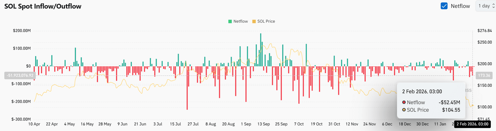 Erkennen Sie Netflows bleiben negativ, wobei etwa 52,4 Millionen US-Dollar an SOL während der letzten Sitzung die Börsen verließen, während der Preis wieder in Richtung 104 US-Dollar anstieg.
