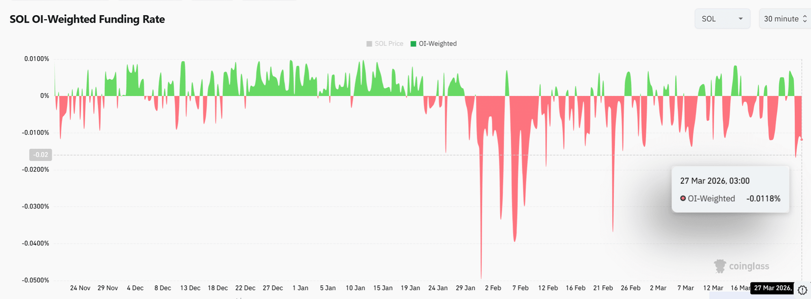 Der OI-gewichteter Finanzierungssatz blieb zum Zeitpunkt des Schreibens negativ bei -0,0118 %, was darauf hindeutet, dass Short-Positionierungen weiterhin den Derivatemarkt dominieren.